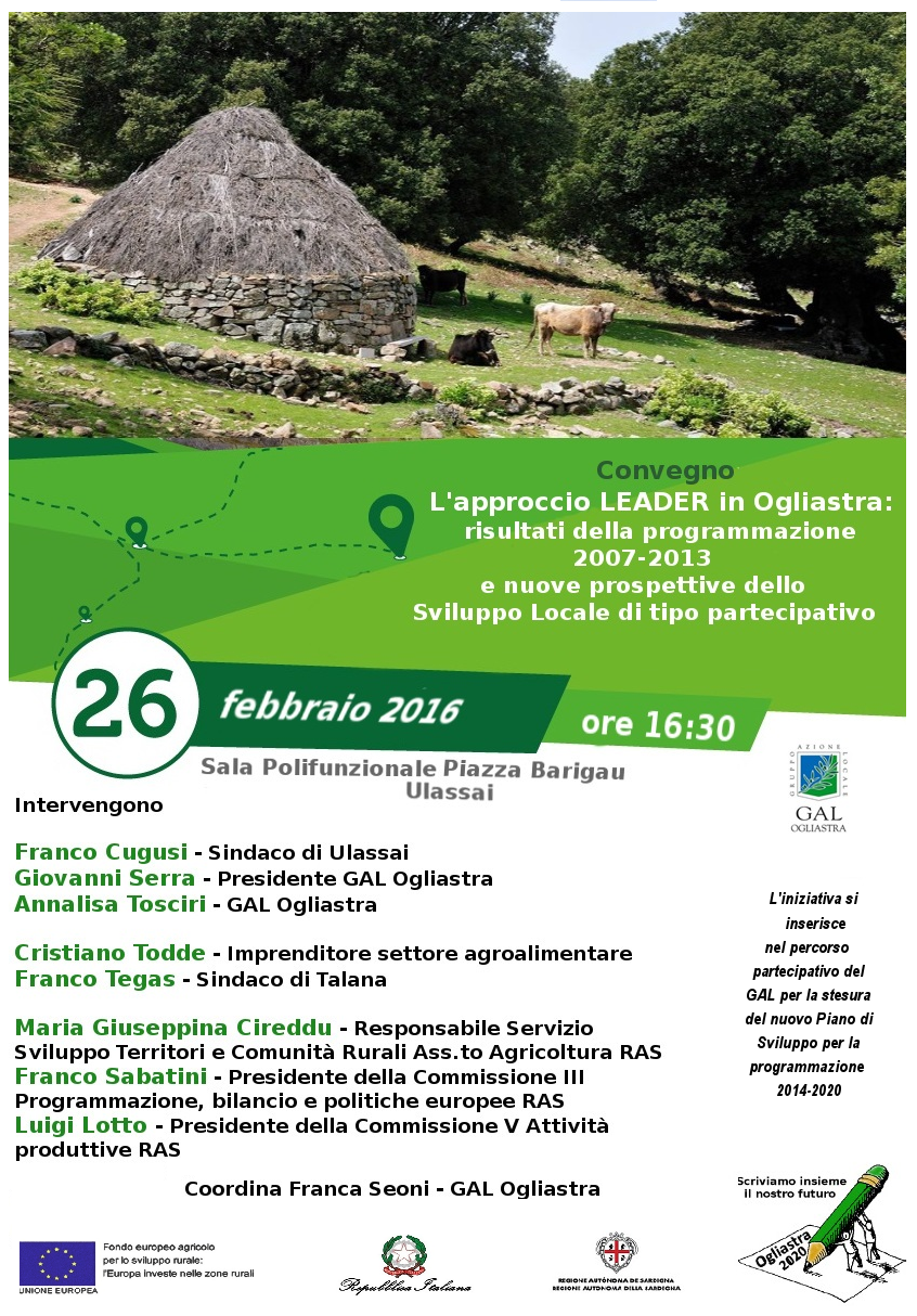 Convegno "L'approccio LEADER in Ogliastra" organizzato e coordinato dal GAL Ogliastra il giorno 26/2/2016 presso la Sala Polifunzionale a Ulassai.