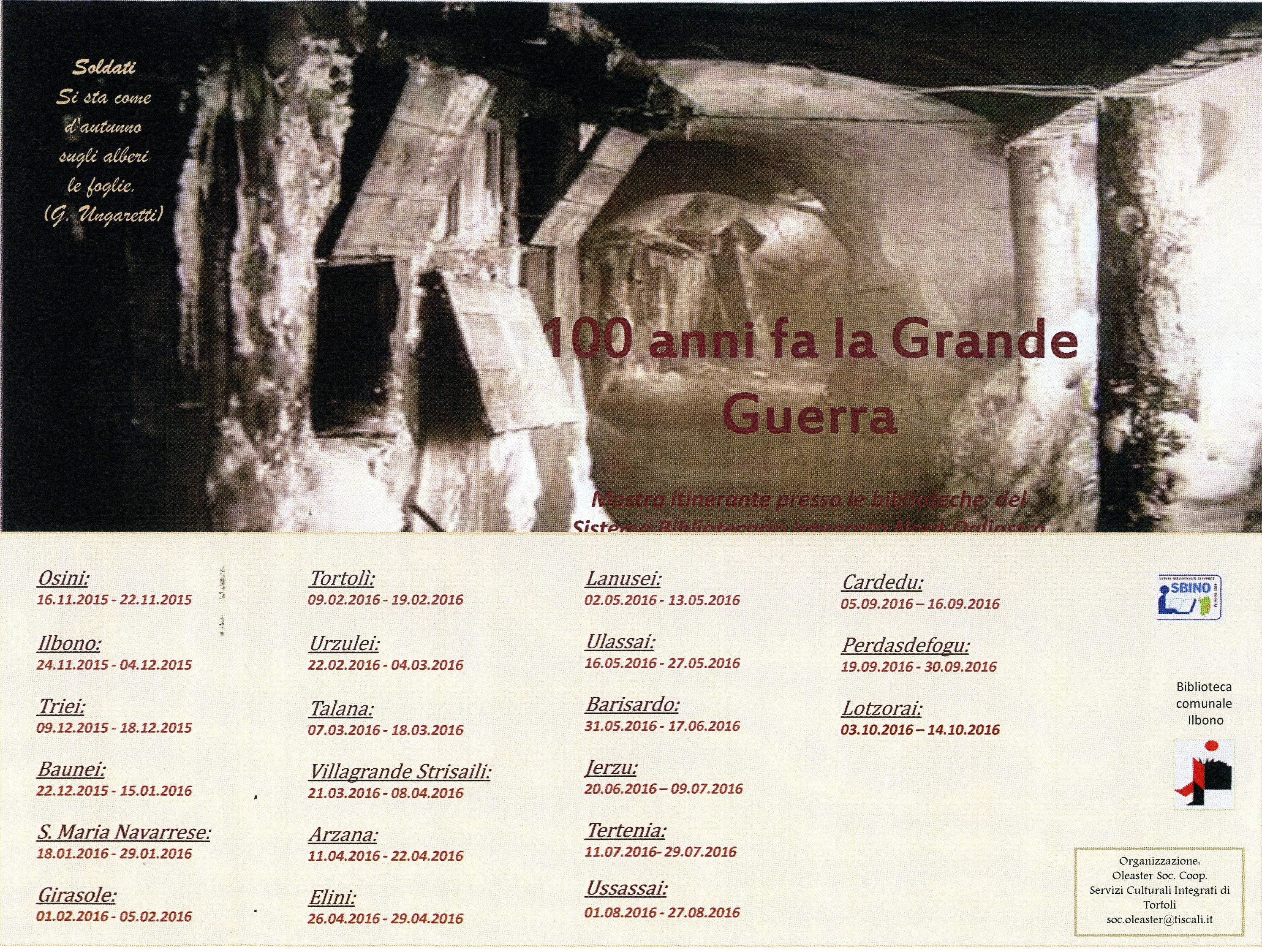 Informiamo che dal 21 marzo all’8 aprile 2016, nella sala conferenze della biblioteca comunale  è allestita una mostra fotografica sulla prima guerra mondiale. Siete tutti invitati a visitarla durante l’orario di apertura della biblioteca.